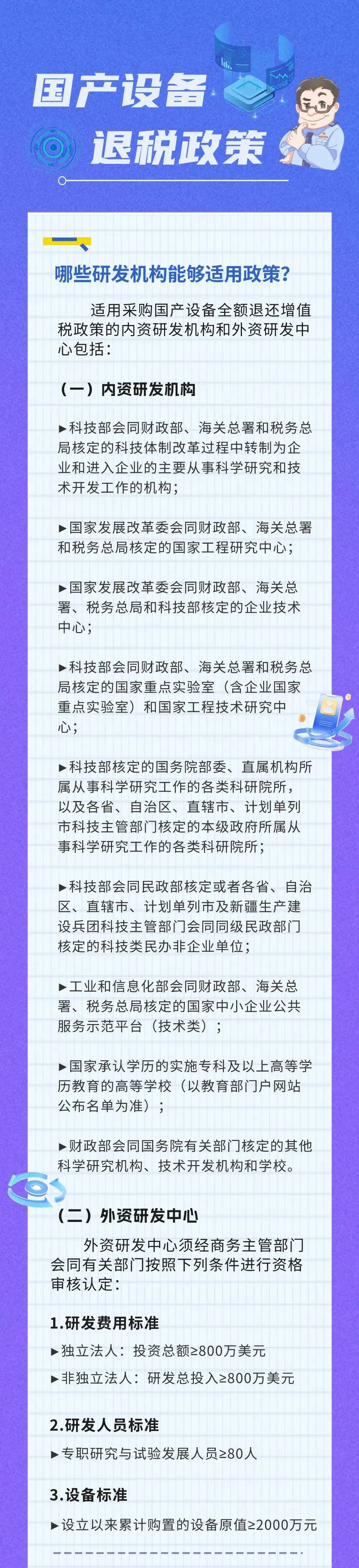 日前,財政部、商務部、稅務總局三部委聯(lián)合發(fā)文《關于研發(fā)機構采購設備增值稅政策的公告》明確指出內資研發(fā)機構和外資研發(fā)中心采購國產設備全額退還增值稅。也就是說只要是研發(fā)中心,采購國產設備,一律退回增值稅!國家在用真金白銀補貼國產設備!其中,哪些研發(fā)機構能夠適用政策?哪些國產設備能夠退還增值稅?享受退稅政策需要做哪些準備?...今天,小編帶您看看具體內容~↓↓↓