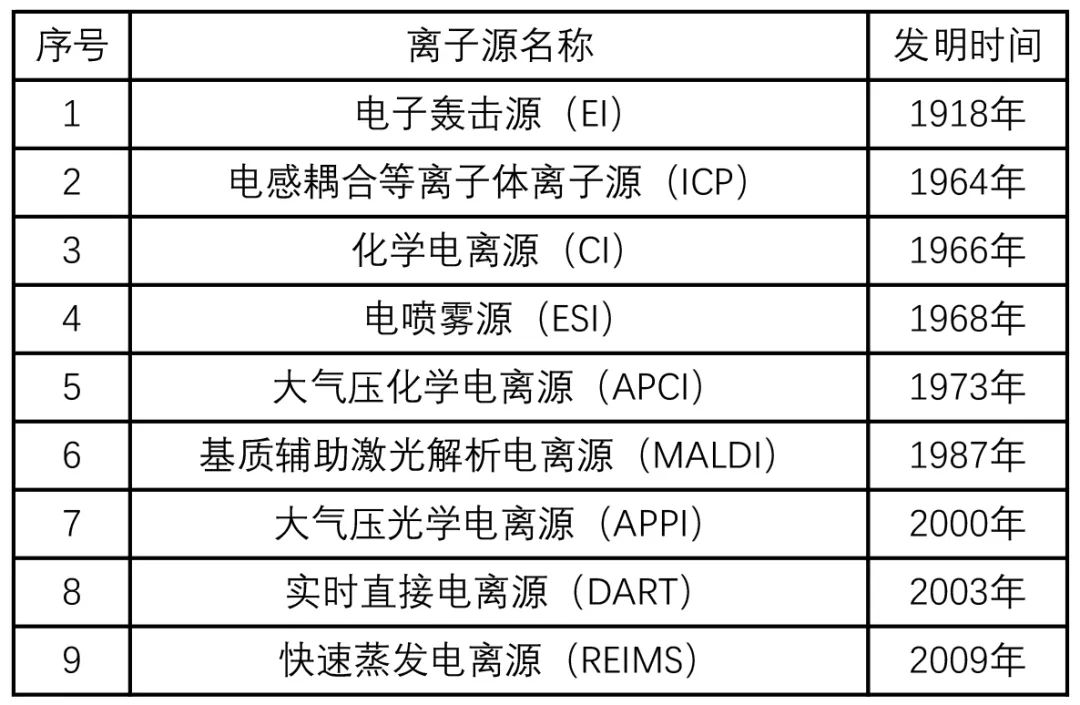 離子源將樣品中的分子或原子離子化,為質譜分析的核心過程提供關鍵離子來源。20世紀初,A.J. Dempster發明了電子轟擊源(EI),這一技術被視為離子源領域的開創性突破。1966年,產生了化學電離(CI)方法,上世紀八十年代,電噴霧電離(ESI)技術以及基質輔助激光解吸電離[10](MALDI)技術發明,并廣泛應用于生物醫學和生物質譜學領域,引領了質譜技術的新發展方向。大氣壓光學電離源(APPI)技術為難溶解或揮發性較低的樣品提供了有效的離子化方法,實時直接電離源(DART)[11]的問世使得質譜分析更加快速便捷。2009年,快速蒸發電離源(REIMS)技術的發明,進一步提高了樣品的分析速度和準確性,為臨床醫學等領域帶來了革命性的變革(表2)??傊x子源技術的創新和升級為質譜技術提供了更廣泛的應用選擇。