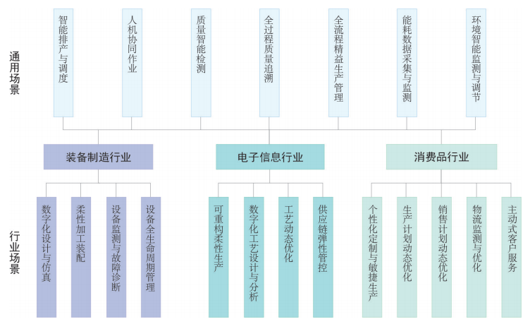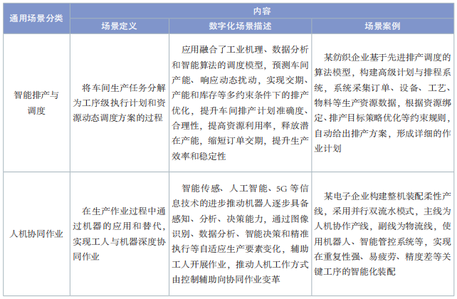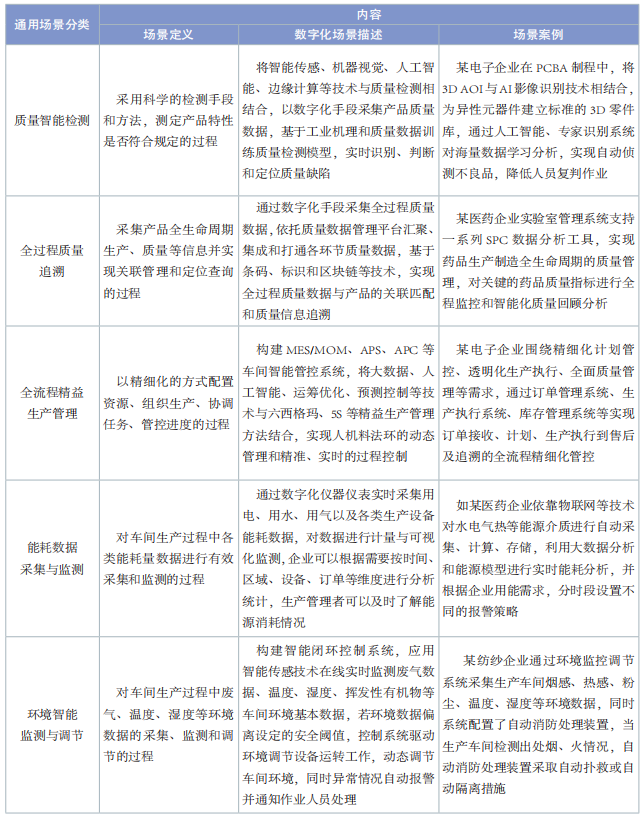 通用場景是指滿足不同行業數字化轉型共性需求的場景,具備在同行業內及不同行業間的推廣價值。通用場景部分整理了裝備制造、電子信息和消費品 3 個行業存在共性需求和相似解決方案的數字化典型場景,包括智能排產與調度、人機協同作業、質量智能檢測、全過程質量追溯、全流程精益生產管理、能耗數據采集與監測、環境智能監測與調節 7個場景,場景內容見表 1。