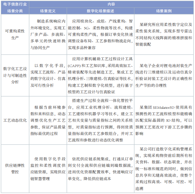 電子信息行業數字化轉型要聚焦人機高效協作、在線精密檢測、人工智能等新技術和產品質量優化、工藝動態優化等典型場景,打造高效配送、資源協同和柔性生產能力,不斷提升產品質量、性能和穩定性。基于此,本文整理出可重構柔性生產、數字化工藝設計與可制造性分析、工藝動態優化、供應鏈彈性管控 4 個典型場景,詳細場景內容見表 3。