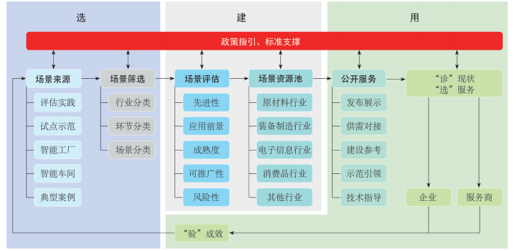 數字化場景資源池建設的關鍵是對外服務,以示范、參考、指導等方式助力企業數字化場景建設??梢酝ㄟ^平臺的方式公開發布優秀場景案例、場景提供方名錄、技術邏輯方案等信息,為轉型企業和服務商打造精準高效的資源獲取和服務對接平臺。有轉型需求的企業可以通過信息發現、場景對比分析,“診”自身場景數字化現狀,快速錨準具體轉型場景,明確轉型方案和目標,同時“選”優秀場景案例指導自身場景數字化建設。服務商可以通過場景對標分析,“診”自身數字化場景方案的成熟度和能力,“選”與自身同方向的優秀場景指導方案優化,持續提升服務能力。企業和服務商的成功實踐通過“驗”之后,將不斷轉化為資源池的場景來源,形成“選”“建”“用”的良性閉環,不斷豐富資源池場景。