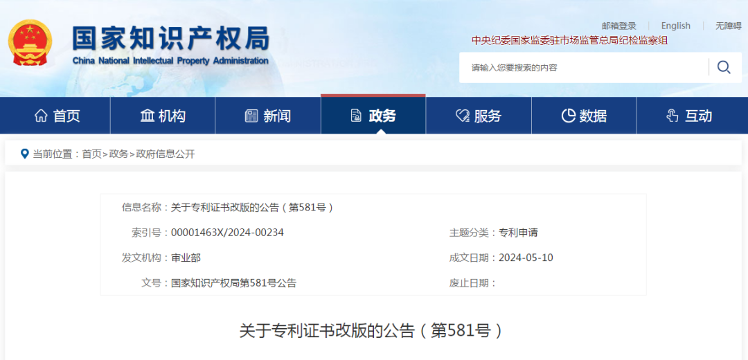 近日,國家知識產(chǎn)權(quán)局發(fā)布關(guān)于專利證書改版的公告(第581號),對于授權(quán)公告日在2024年6月1日之后(含當日)的專利,國家知識產(chǎn)權(quán)局頒發(fā)新版專利證書。新版專利證書沿用A4規(guī)格豎排版式,優(yōu)化調(diào)整著錄事項布局。