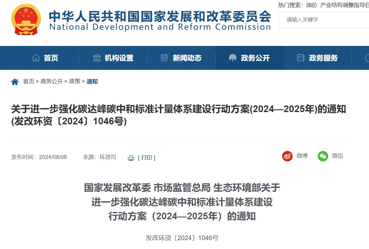 國家發(fā)展改革委 市場監(jiān)管總局 生態(tài)環(huán)境部關(guān)于進一步強化碳達峰碳中和標(biāo)準(zhǔn)計量體系建設(shè)行動方案(2024—2025年)的通知