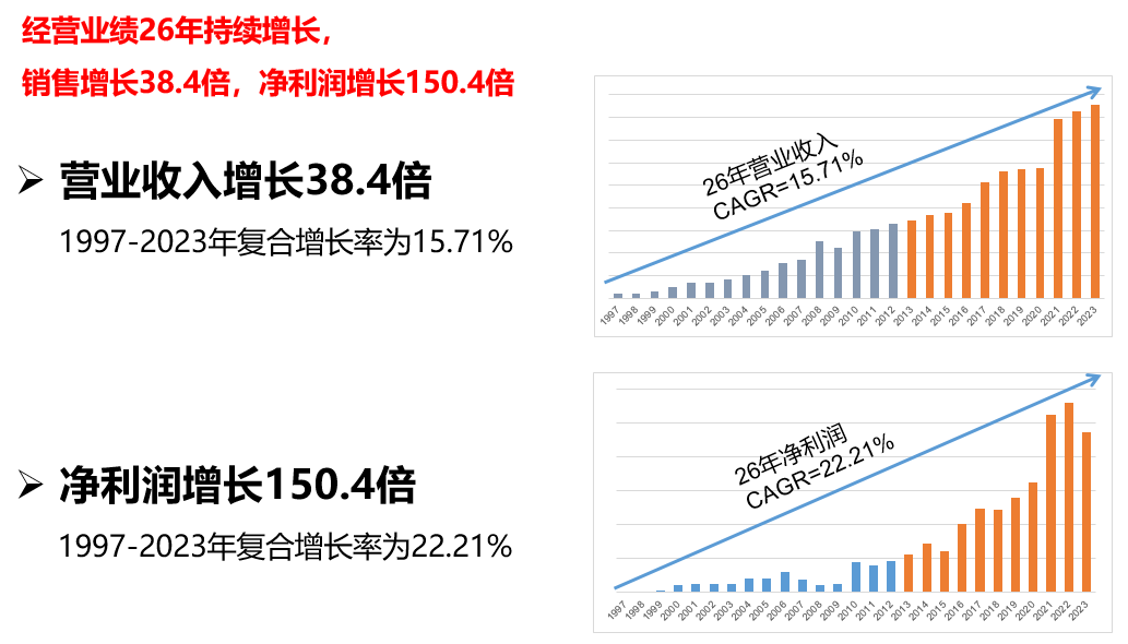 成立26年來,公司銷售增長(zhǎng)38.4倍,凈利潤(rùn)增長(zhǎng)150.4倍,凈利潤(rùn)年復(fù)合增長(zhǎng)達(dá)22.21%。