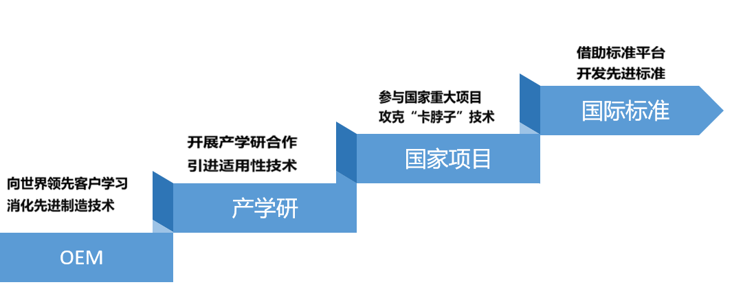 堅(jiān)持高強(qiáng)度研發(fā)投入支持創(chuàng)新,近三年研發(fā)投入營(yíng)收占比均超8%,2023年超10%。公司總結(jié)出階梯式科技資源整合創(chuàng)新路徑,從早期向領(lǐng)先客戶學(xué)習(xí)基本的生產(chǎn)工藝與產(chǎn)品設(shè)計(jì)知識(shí),到與高校院所進(jìn)行產(chǎn)學(xué)研合作學(xué)習(xí)新產(chǎn)品開發(fā),再到參與國(guó)家重大工程進(jìn)行研發(fā)學(xué)習(xí)來探索前沿技術(shù)。現(xiàn)階段是借助標(biāo)準(zhǔn)平臺(tái)開發(fā)先進(jìn)標(biāo)準(zhǔn),在標(biāo)準(zhǔn)制定中學(xué)。