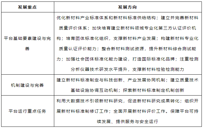 新材料評價、表征、標準平臺建設主要包括平臺基礎要素建設與完善、機制建設與完善、平臺運行重點任務等重點發展方向(見表8)。