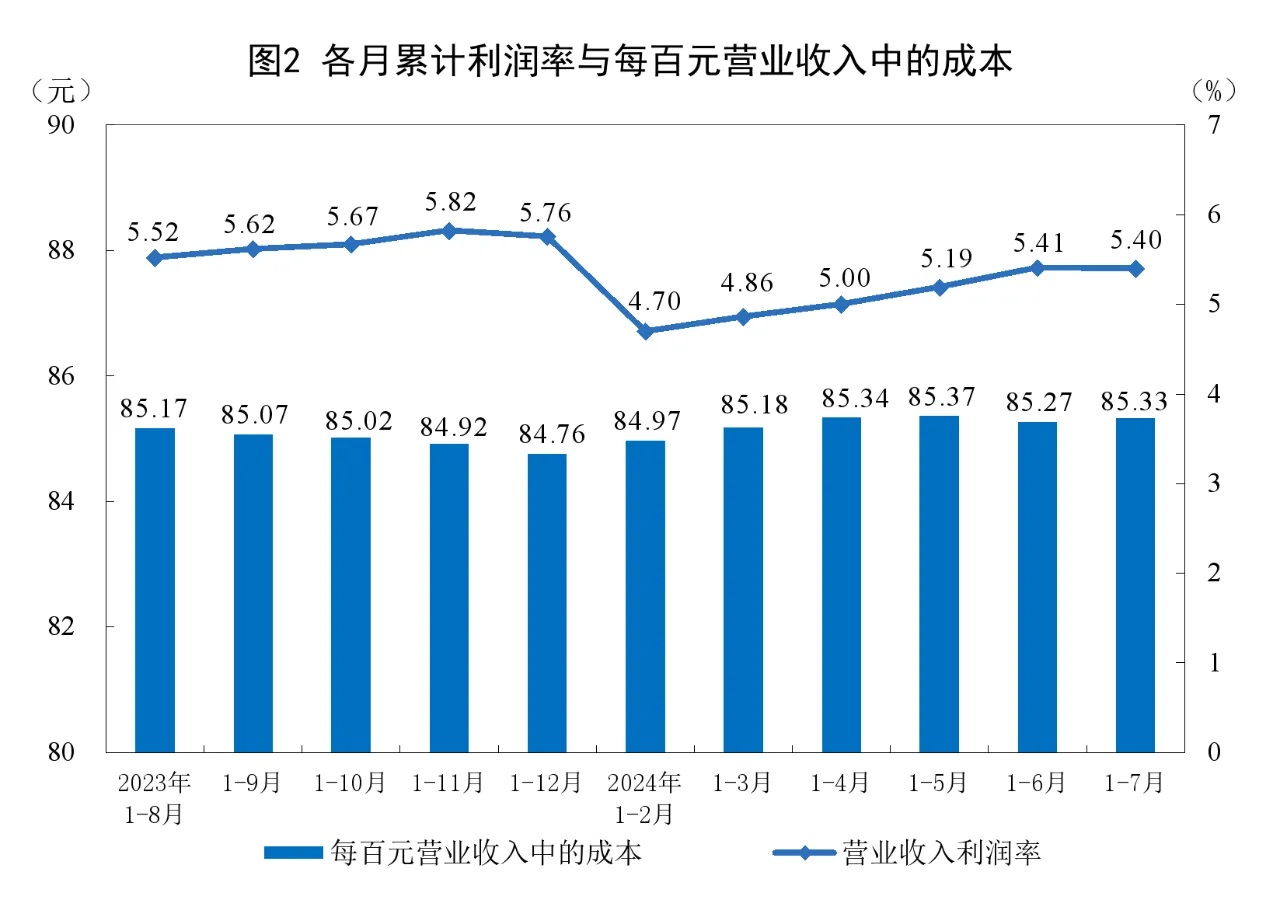 1—7月份,規(guī)模以上工業(yè)企業(yè)實現(xiàn)營業(yè)收入75.93萬億元,同比增長2.9%;發(fā)生營業(yè)成本64.79萬億元,增長3.0%;營業(yè)收入利潤率為5.40%,同比提高0.04個百分點。