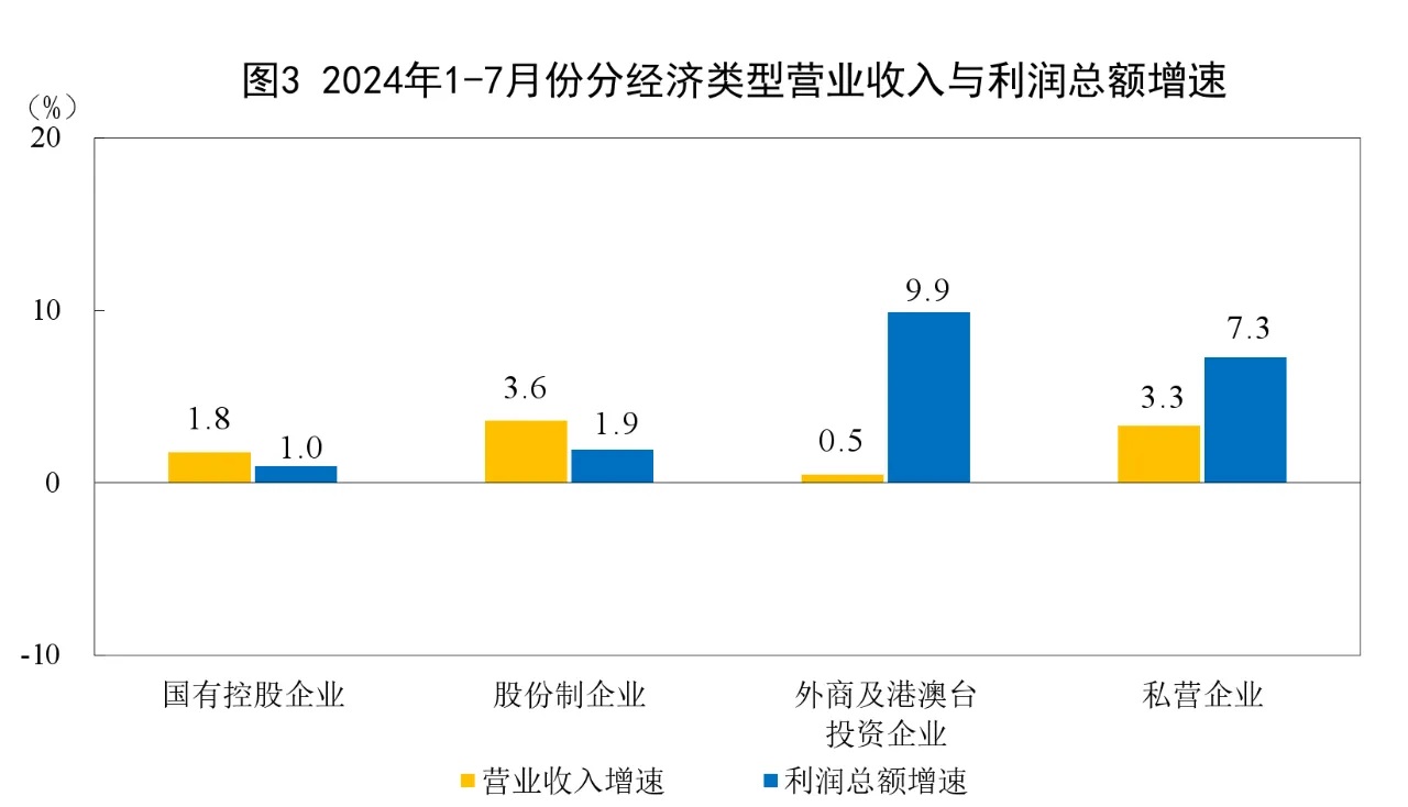1—7月份,規(guī)模以上工業(yè)企業(yè)中,國有控股企業(yè)實現(xiàn)利潤總額13917.3億元,同比增長1.0%;股份制企業(yè)實現(xiàn)利潤總額30514.6億元,增長1.9%;外商及港澳臺投資企業(yè)實現(xiàn)利潤總額10184.9億元,增長9.9%;私營企業(yè)實現(xiàn)利潤總額11031.0億元,增長7.3%。