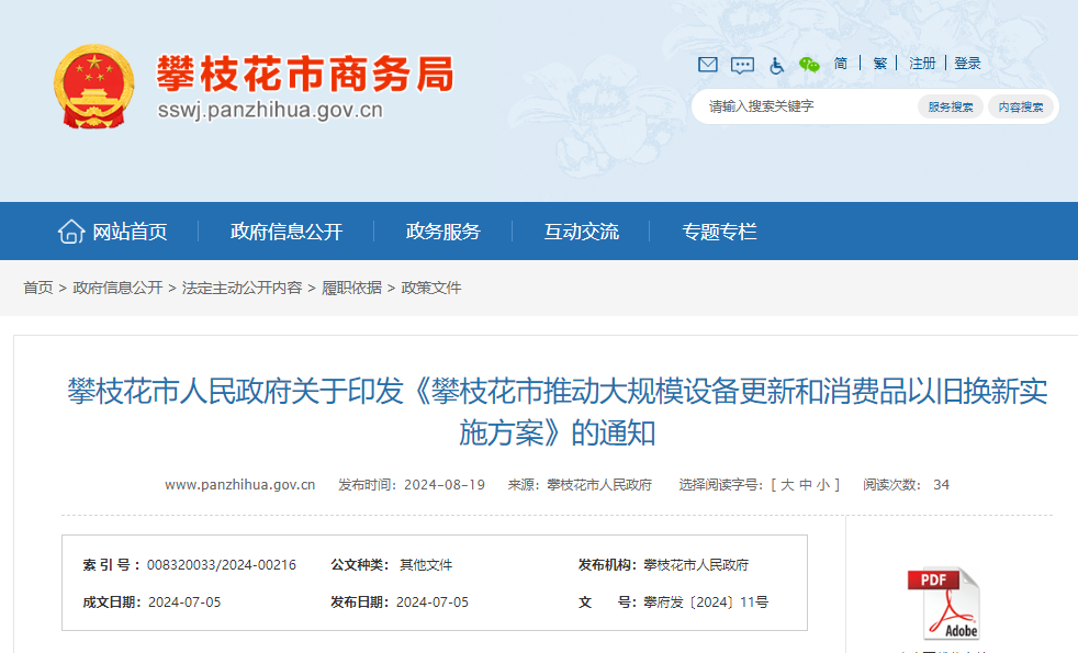 關(guān)于印發(fā)《攀枝花市推動大規(guī)模設(shè)備更新和消費(fèi)品以舊換新實(shí)施方案》的通知