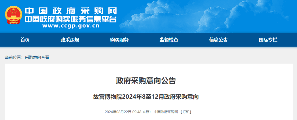 為便于供應商及時了解政府采購信息,根據《財政部關于開展政府采購意向公開工作的通知》(財庫〔2020〕10號)等有關規定,現將故宮博物院2024年8至12月政府采購意向公開如下: