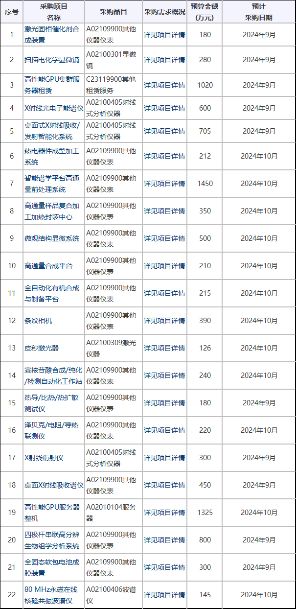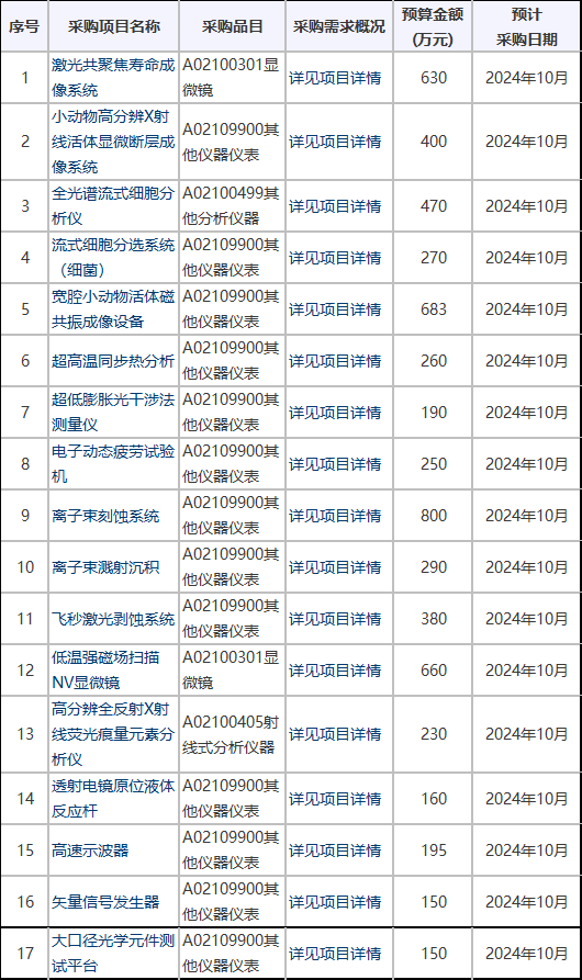 2024年9月2日,中國科學(xué)技術(shù)大學(xué)公布2024年9至12月政府采購意向清單,涉及掃描電化學(xué)顯微鏡、X射線衍射儀、疲勞試驗(yàn)機(jī)、測(cè)量?jī)x、高速示波器等多種儀器設(shè)備,預(yù)算總額超過1.6億元。