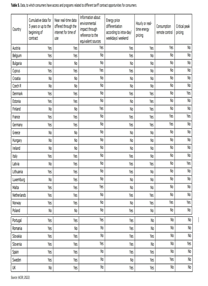 - 根據(jù)靈活的電價提供的電力計劃。在這里,我們描述了消費(fèi)者可以通過智能電表獲得的信息,以及有關(guān)通過智能電表提供的資費(fèi)計劃的信息。表5顯示了消費(fèi)者可以獲得的歷史消費(fèi)量,以及有關(guān)不同國家/地區(qū)通過智能電表提供的靈活關(guān)稅產(chǎn)品的信息。這些計劃改善了消費(fèi)者的賦權(quán),因為它們使客戶能夠調(diào)整電力消耗并利用動態(tài)電價。為了讓計劃生效,客戶需要對價格信號做出反應(yīng)。預(yù)計從 2023 年起將不再提供固定價格合同,而《電力內(nèi)部市場指令》規(guī)定,成員國必須確保配備智能電表的消費(fèi)者能夠至少從一家供應(yīng)商(擁有超過 200,000 名客戶)獲得動態(tài)價格合同。應(yīng)向消費(fèi)者明確此類合同的特征(ACER,2022 年)。