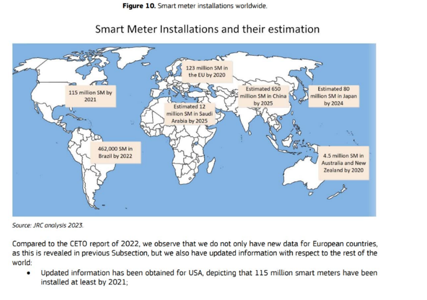 - 全球安裝了超過12億臺智能電表,其中歐洲、澳大利亞和北美是該領(lǐng)域的先驅(qū),僅在歐盟安裝了超過 1.23 億臺智能電表(小編補(bǔ)充:中國迄今已安裝超過6億只智能電表)。