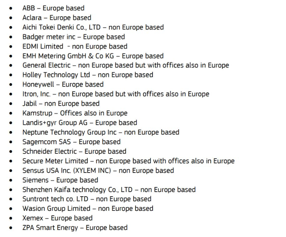 附下是一些智能電表市場領(lǐng)先者的名單(按字母順序,并非詳盡無遺),證明了全球智能電表計劃的合理性。正如我們所看到的,歐洲制造商在該領(lǐng)域擁有強(qiáng)大的影響力。除了列出制造商外,還試圖根據(jù)其所在地對制造商進(jìn)行分類,以確定歐洲制造商。雖然對于一些制造商來說,他們的分類相當(dāng)簡單,但對于其他制造商來說,很難說,因為他們在世界各地都有活動,而對于其他制造商來說,信息不足以斷定他們是否在歐洲也有辦事處。以下列表給出了歐洲制造商在該領(lǐng)域的存在,并表明了這種情況。