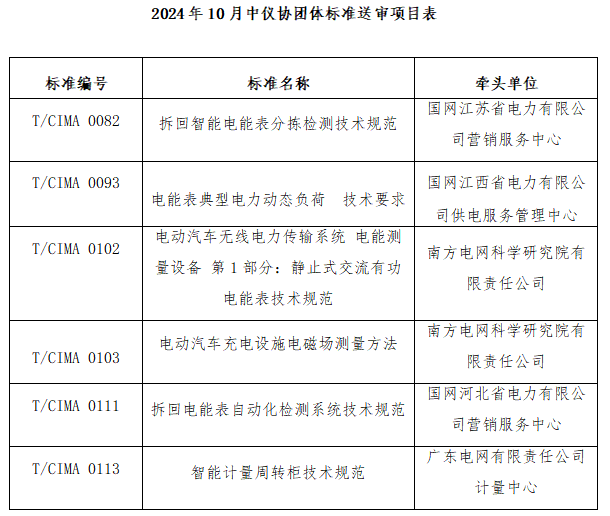 2024年10月 24-25日,中國儀器儀表行業(yè)協(xié)會(以下簡稱“協(xié)會”) 以視頻會議形式組織召開了《電能表典型電力動態(tài)負(fù)荷 技術(shù)要求》等6項團體標(biāo)準(zhǔn)(項目信息詳見附表)送審稿審查會。來自國網(wǎng)山東省電力公司電力科學(xué)研究院、廣東電網(wǎng)有限責(zé)任公司計量中心、中國電力科學(xué)研究院計量研究所、國網(wǎng)浙江省電力有限公司營銷服務(wù)中心、廣西電網(wǎng)計量中心、中國電力科學(xué)研究院有限公司、國網(wǎng)河南省電力公司營銷服務(wù)中心、國網(wǎng)山東省電力公司、黑龍江省電工儀器儀表工程技術(shù)研究中心有限公司的九位專家組成審查組,國網(wǎng)山東省電力公司電力科學(xué)研究院的徐民教授級高工擔(dān)任組長。會議由協(xié)會副秘書長程紅主持。協(xié)會及電工儀表分會的團體標(biāo)準(zhǔn)工作人員、標(biāo)準(zhǔn)主要起草人參加了本次會議。
