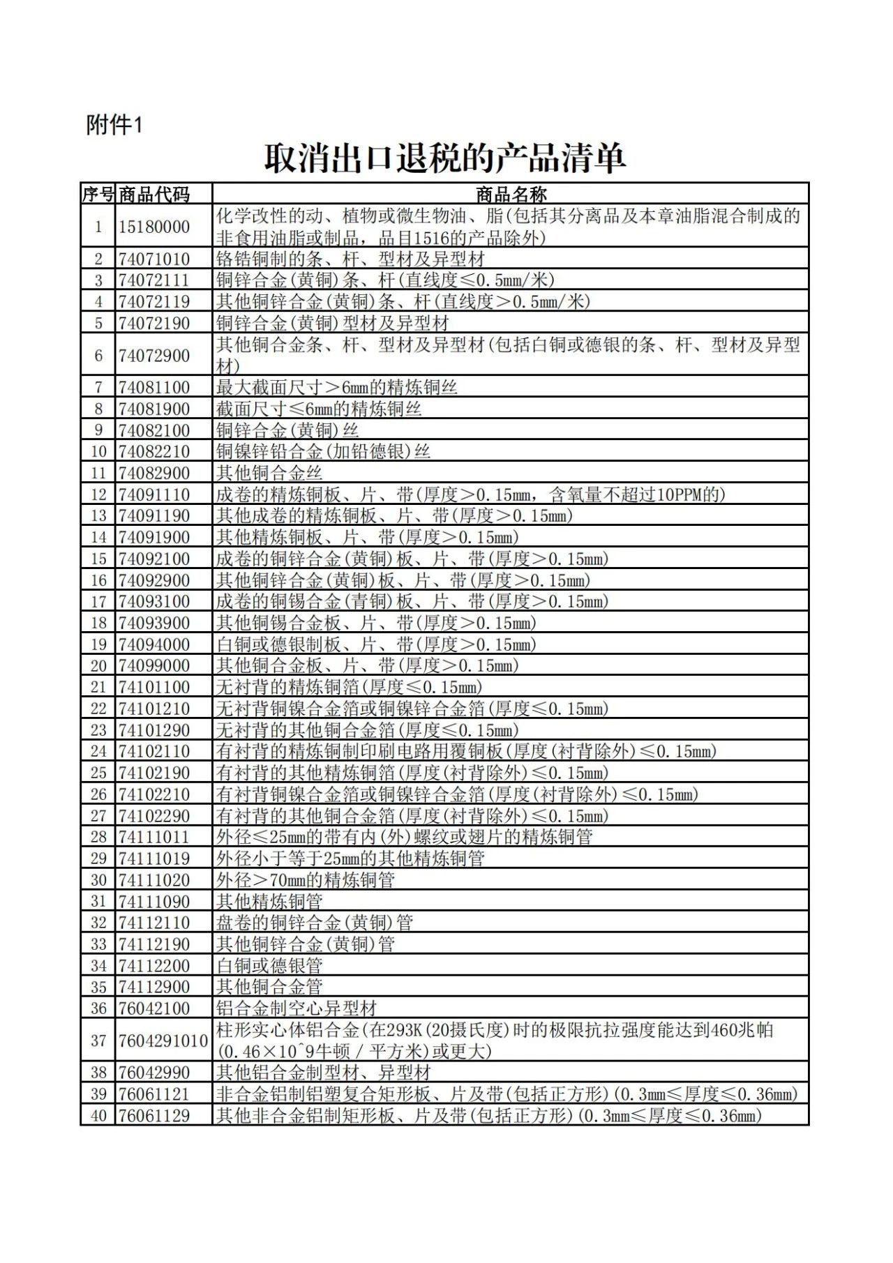 一、取消鋁材、銅材以及化學改性的動、植物或微生物油、脂等產品出口退稅。