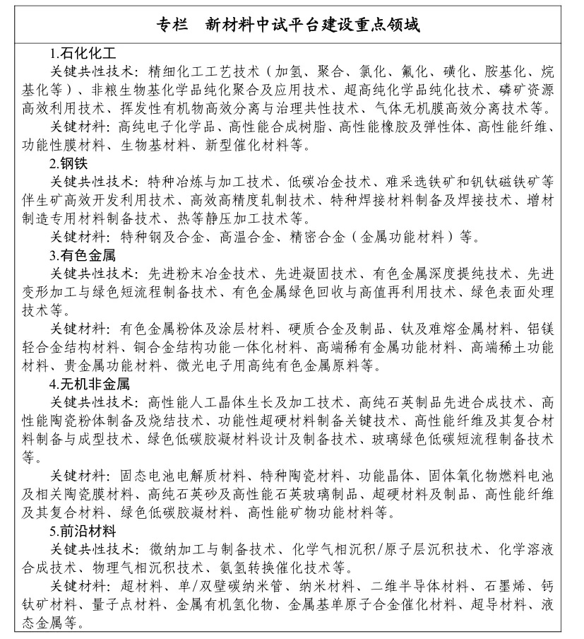 文件也進一步明確了新材料中試平臺建設(shè)重點領(lǐng)域,詳情如下所示: