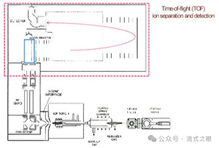 富集后的離子云被送到時間飛行質譜儀(TOF-MS)中,根據離子的質荷比(m/z)對離子進行分離和檢測,不同質荷比的離子在飛行時間上有所差異,TOF-MS 用于對經過 ICP-MS 離子化后的金屬離子進行精確測量,實現了對不同金屬標記的生物分子的準確識別和定量,過程如下(圖2-5):
