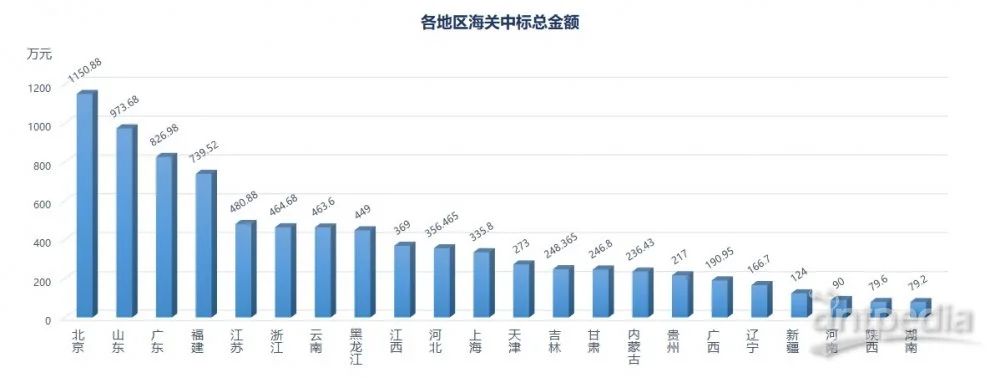 在采購金額方面,北京、山東和廣東依舊名列前茅,中標金額分別達到1150.88萬元、973.68萬元和826.98萬元,福建和江蘇也表現突出,中標金額為739.52萬元和 480.88萬元。排名前五的地區,其中標金額之和占據了總中標金額的近50%。同時也可以看出,中標金額與中標數量密切相關。