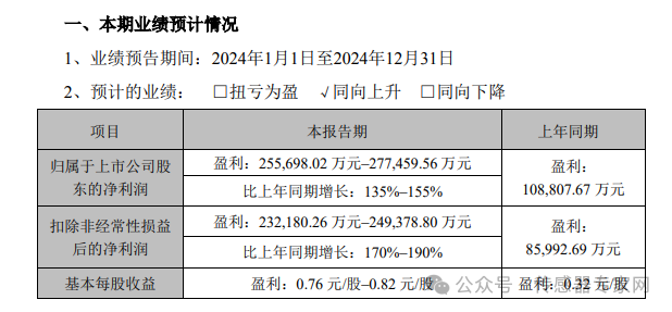 預(yù)計(jì)2024年歸屬于上市公司股東的凈利潤(rùn)為255,698.02 萬(wàn)元–277,459.56 萬(wàn)元,比上年同期增長(zhǎng):135%–155%。扣除非經(jīng)常性損益后的凈利潤(rùn)為232,180.26 萬(wàn)元–249,378.80 萬(wàn)元,比上年同期增長(zhǎng):170%–190%,基本每股收益0.76 元/股–0.82 元/股。
