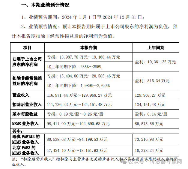 報(bào)告期內(nèi),歸屬于上市公司股東的凈利潤(rùn)為-13,987.78 萬(wàn)元~-19,168.44 萬(wàn)元,比上年同期下降235%~285%,扣除非經(jīng)常性損益后的凈利潤(rùn) 為-15,404.80 萬(wàn)元~-20,585.46 萬(wàn)元,比上年同期下降1,989%~2,625%,營(yíng)業(yè)收入116,971.44 萬(wàn)元~129,968.27 萬(wàn)元,MEMS 業(yè)務(wù)收入98,411.90 萬(wàn)元~102,690.68 萬(wàn)元,瑞典 FAB1&2 的MEMS 業(yè)務(wù)收入80,538.68 萬(wàn)元~84,199.53 萬(wàn)元 ,北京 FAB3 的MEMS 業(yè)務(wù)收入17,124.10 萬(wàn)元~18,161.93 萬(wàn)元。