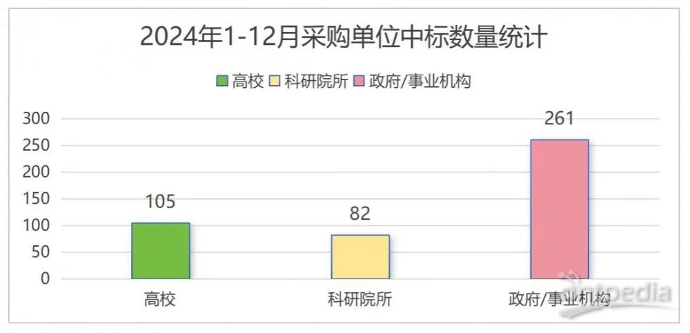 2024年氣相色譜儀的采購市場中,政府和事業機構的采購占據主導地位,占比達到58.2%,中標金額超過1.2億元人民幣。高校的采購規模也較為可觀,共采購105臺(套),占比達23.4%。與此同時,科研院所的采購數量為82臺(套),盡管采購數量略低于高校,但中標金額卻反超高校,達到3923.98萬元。這表明科研院所對高端氣相色譜儀的需求持續增長,且采購的設備多為高性能、高價值的產品。