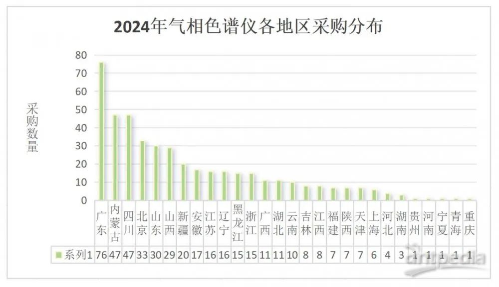 20241-12月,全國共有28個省市發布了氣相色譜儀的采購需求。其中,廣東、內蒙古和四川的采購項目數量位居前三,分別發布了76臺(套)、47臺(套)和47臺(套)的采購需求。此外,北京、山東、山西和新疆的采購需求也較為顯著,分別發布了33臺(套)、30臺(套)、29臺(套)和20臺(套)。