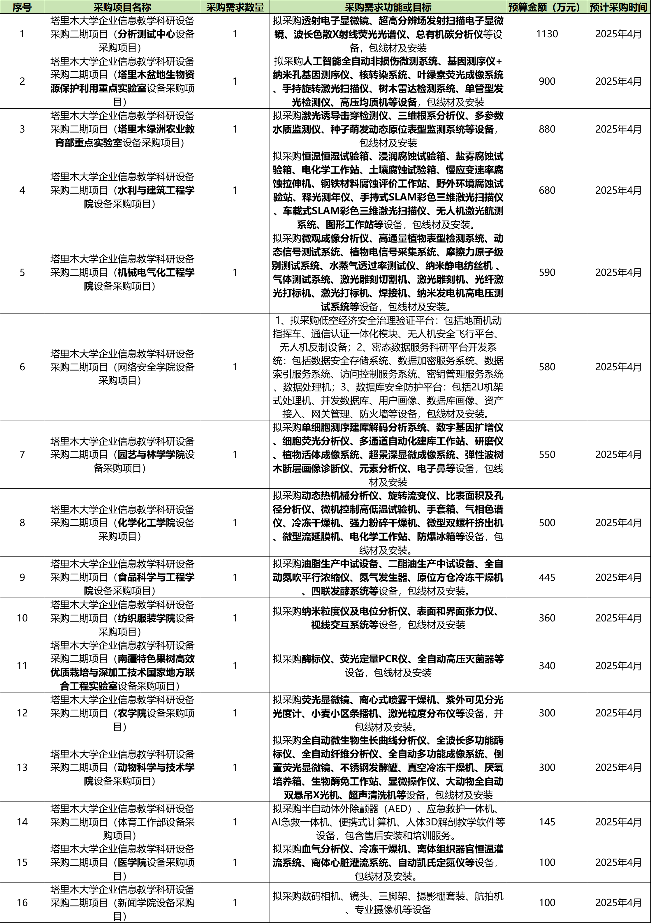 采購意向內容顯示,本批次采購的儀器設備主要用于分析測試中心、塔里木盆地生物資源保護利用重點實驗室塔里木綠洲農業教育部重點實驗室、南疆特色果樹高效優質栽培與深加工技術國家地方聯合工程實驗室、食品科學與工程學院、動物科學與技術學院、紡織服裝學院、醫學院等單位,用以強化實驗室科研能力,提高科研水平,支撐學科發展。