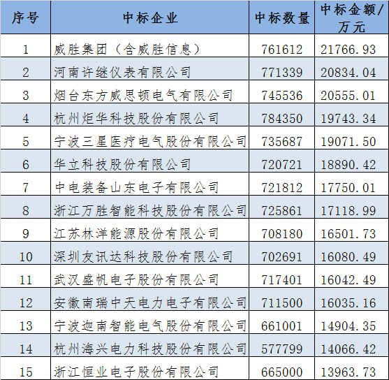 2025年度第一次招標(biāo)電能表采集整體中標(biāo)金額前15企業(yè)