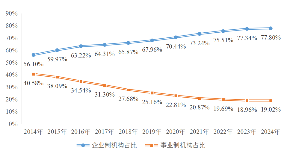 圖1-1 2014-2024年企業(yè)制機構(gòu)和事業(yè)制機構(gòu)占比情況