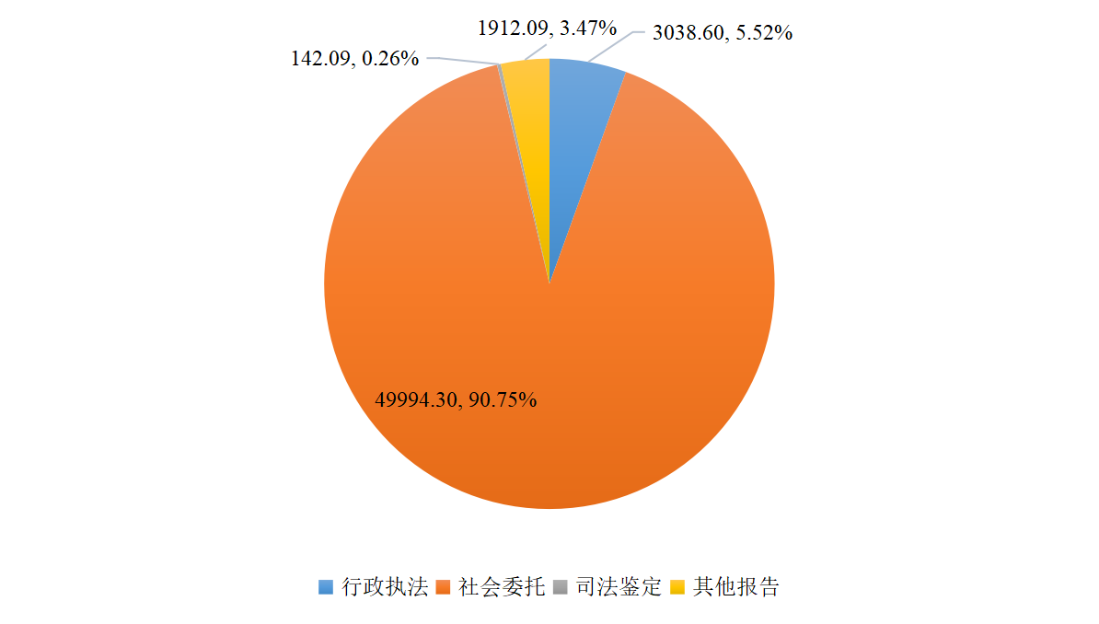 2024年共出具檢驗檢測報告5.51億份,同比下降8.66%,平均每天對社會出具各類報告150.92萬份。其中,出具行政執(zhí)法類報告3038.60萬份,占比5.52%,同比下降8.25%;出具社會委托類報告49994.30萬份,占比90.75%,同比下降7.06%;出具司法鑒定類報告數(shù)142.09萬份,占比0.26%,同比增長0.76%。