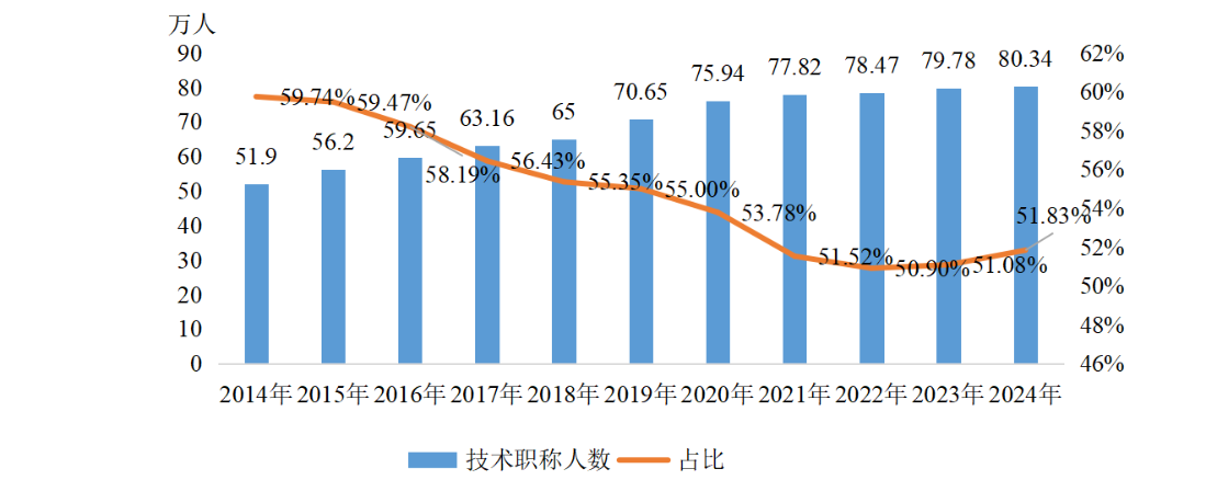 圖1-4 2014-2024年全國檢驗檢測機構(gòu)擁有技術(shù)職稱人員分布情況