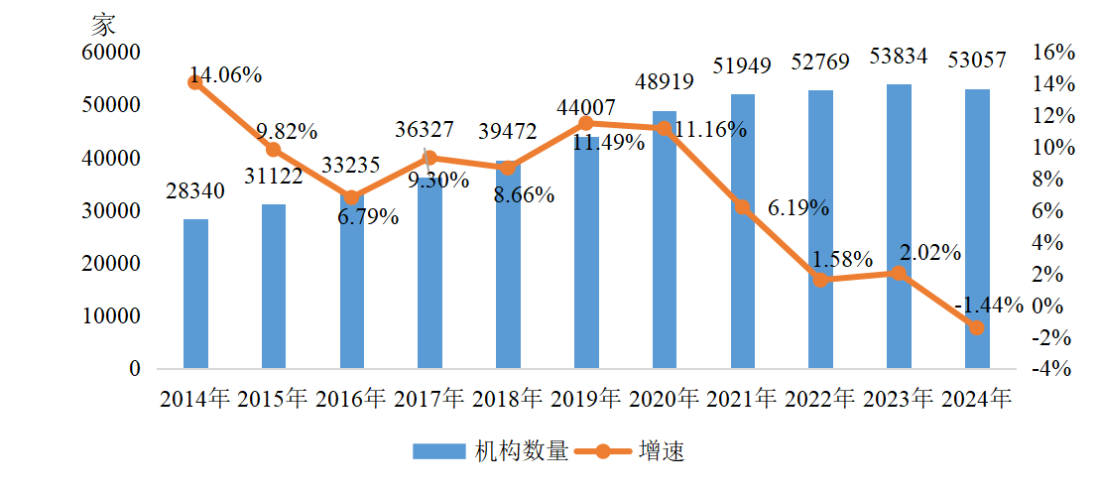圖2-1 2014-2024年全國檢驗檢測機構(gòu)數(shù)量及增速情況