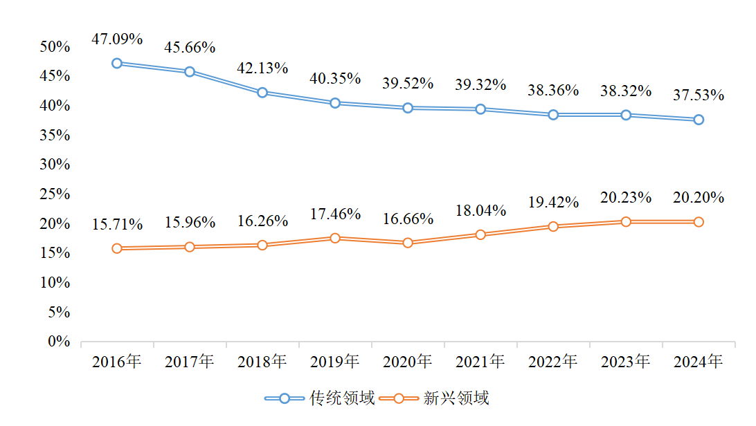 圖2-2 2016-2024年檢驗檢測傳統(tǒng)和新興領(lǐng)域占行業(yè)總收入比重情況