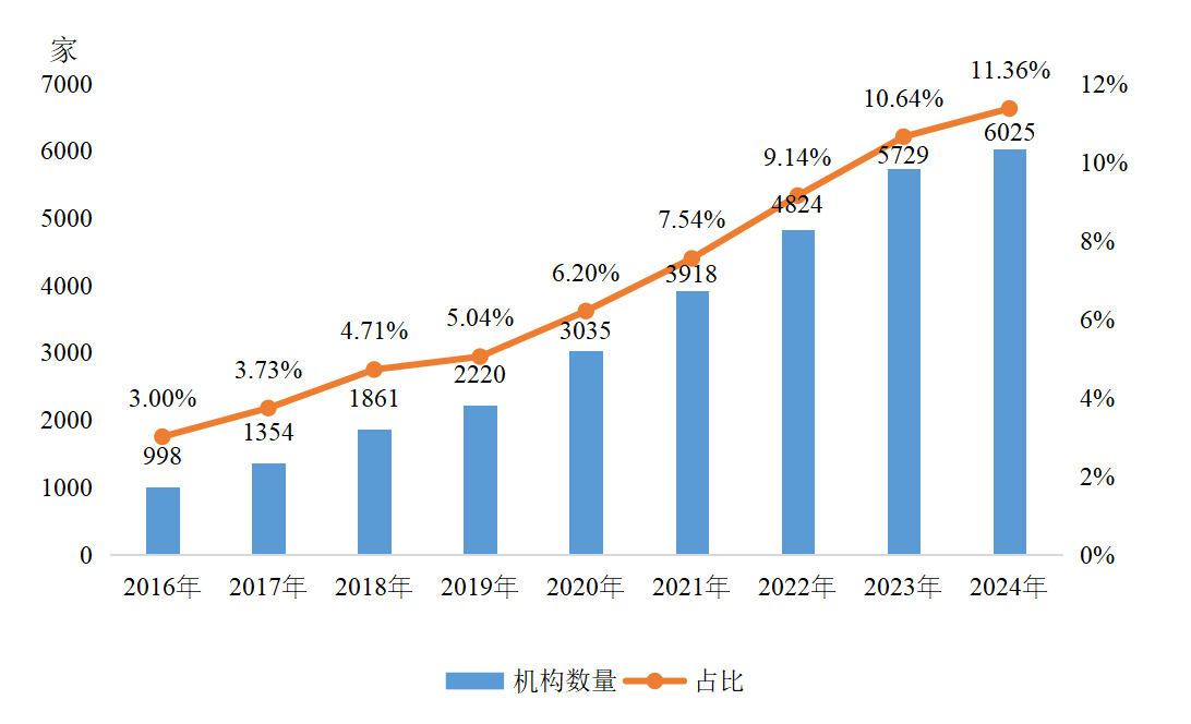 圖3-2 2014-2024年小型和微型檢驗檢測機構(gòu)數(shù)量及占比情況