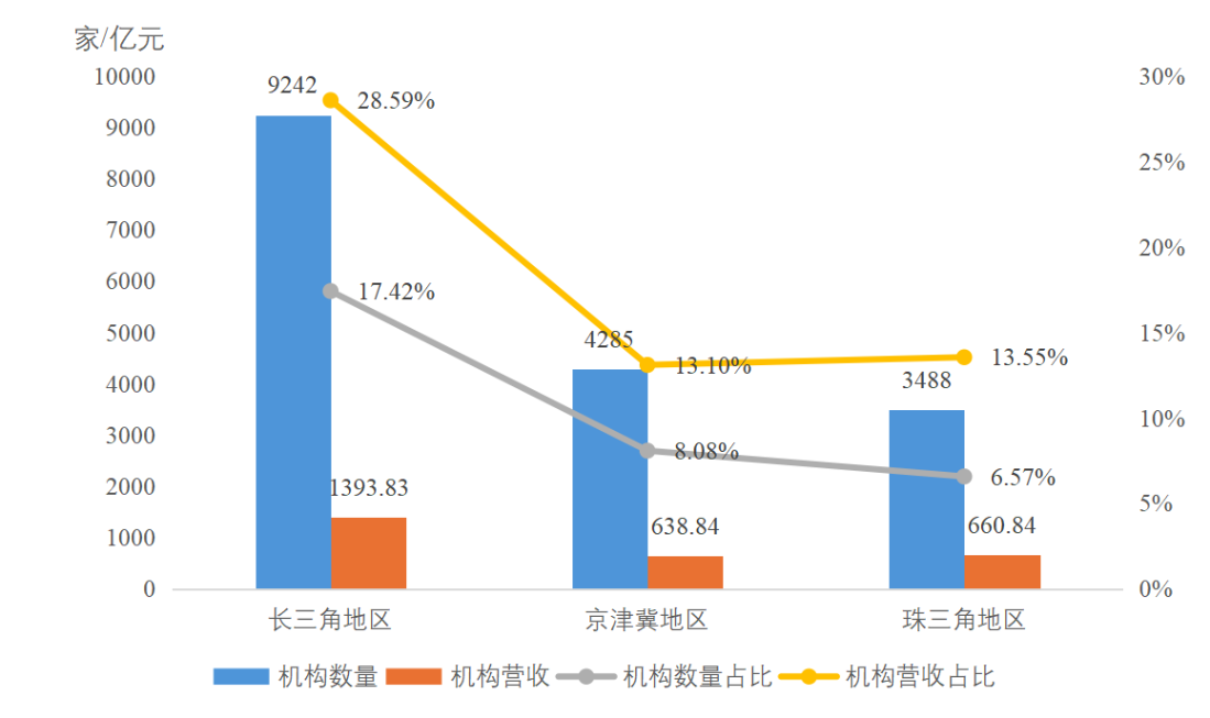 圖4-2 2024年長三角、京津冀和珠三角地區(qū)機構(gòu)數(shù)量、營收及占比情況