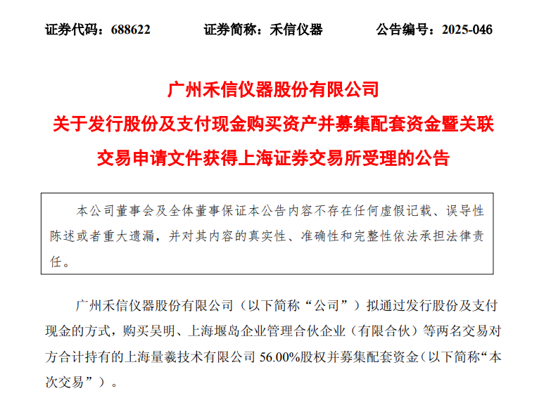 日前,廣州禾信儀器股份有限公司(證券代碼:688622)的重磅資本運(yùn)作迎來(lái)關(guān)鍵進(jìn)展。禾信儀器并購(gòu)重組被受理,擬收購(gòu)量羲技術(shù)56.00%的股權(quán)。公司公告其發(fā)行股份及支付現(xiàn)金購(gòu)買資產(chǎn)并募集配套資金的申請(qǐng)文件,已獲上海證券交易所正式受理。