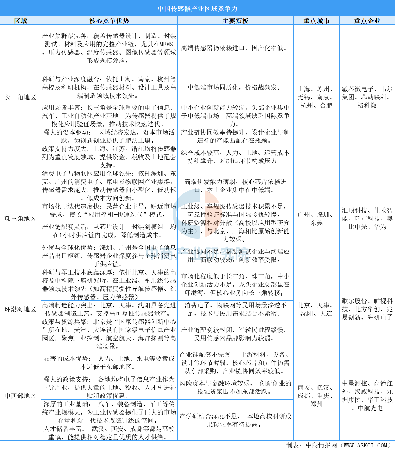 中國傳感器產業經過多年發展,已形成“長三角領跑、珠三角跟進、環渤海深耕、中西部特色突破”的區域競爭格局。長三角地區產業鏈最完整、資本與創新資源集聚,但高端領域依賴進口且成本攀升;珠三角憑借消費電子市場優勢實現快速迭代,但研發基礎相對薄弱;環渤海地區科研實力雄厚、專注高端工業與軍用傳感器,但市場化與民用轉化不足;中西部地區具備成本優勢與政策支持,正在承接產業轉移,但配套體系與創新能力仍需加強。整體而言,各區域在產業鏈不同環節形成互補,但仍需突破高端技術瓶頸、提升產學研協同效率和國際化競爭力。