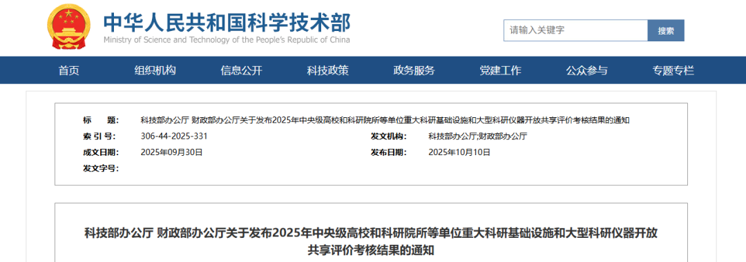 10月10日,科技部辦公廳、財(cái)政部辦公廳發(fā)布了《關(guān)于發(fā)布2025年中央級(jí)高校和科研院所等單位重大科研基礎(chǔ)設(shè)施和大型科研儀器開放共享評(píng)價(jià)考核結(jié)果的通知》。