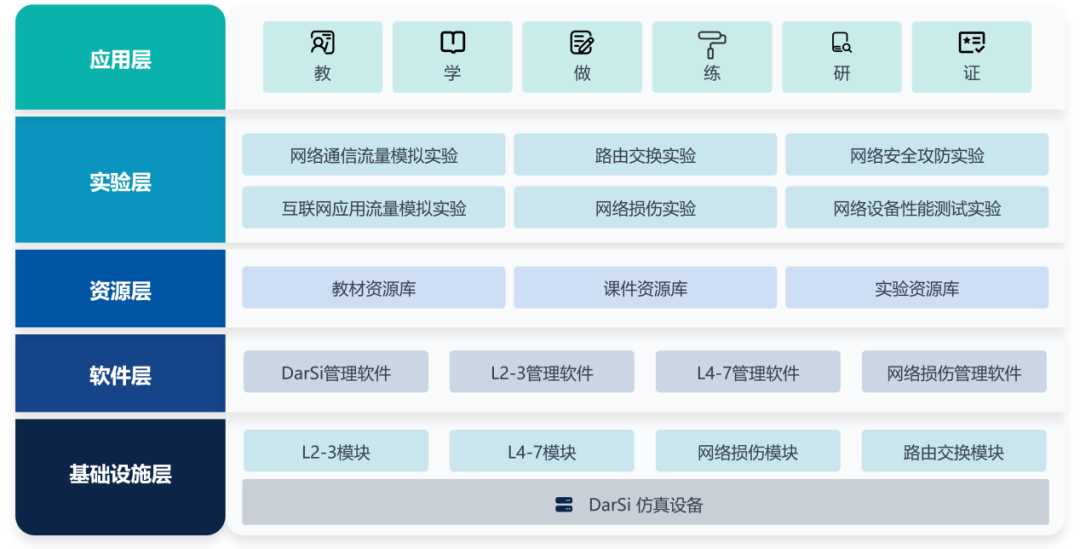 5. 基礎設施層 (Infrastructure Layer)DarSi 設備為基礎,集成了模塊化的硬件功能,包括 L2-3模塊、L4-7模塊、網絡損傷模塊和路由交換模塊。這為模擬真實網絡環境的“規模”和“復雜度”提供了強大的硬件保障。