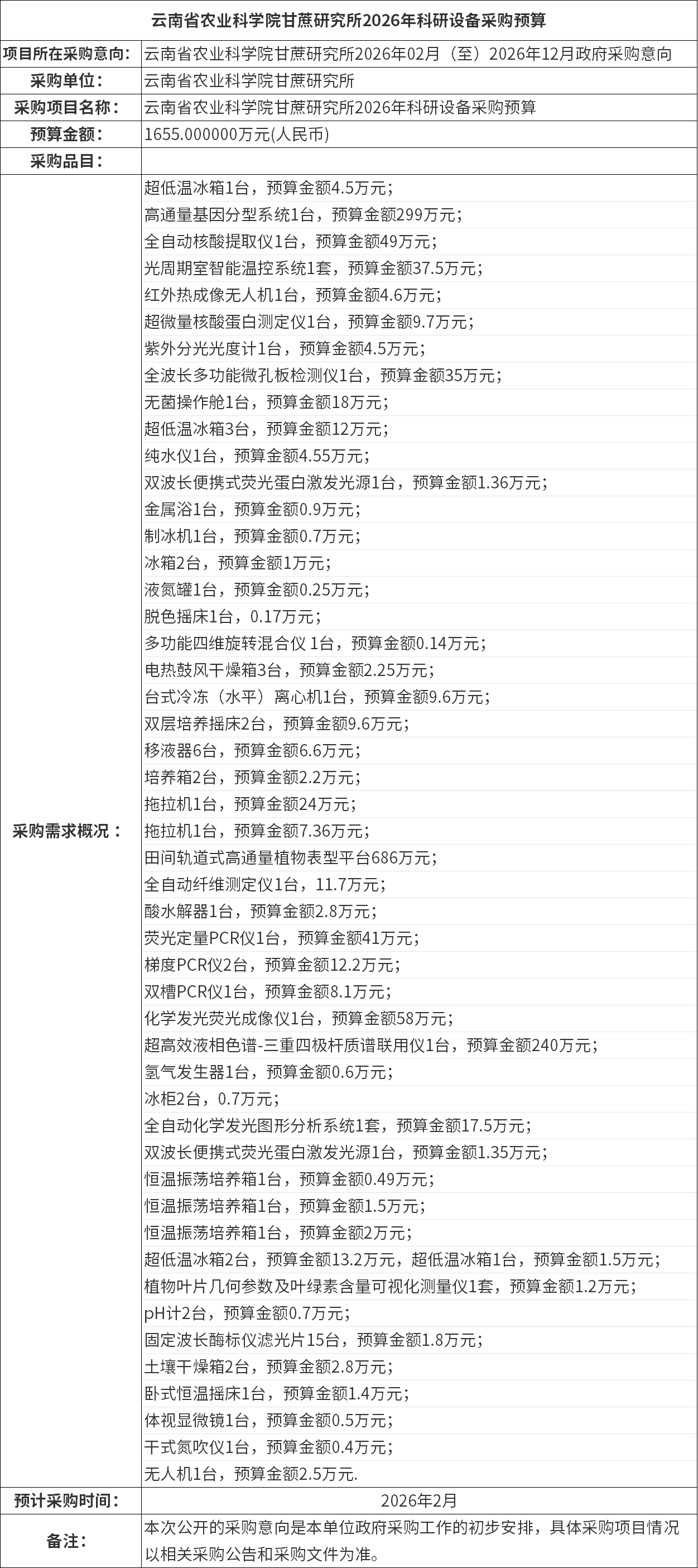 云南省農(nóng)業(yè)科學院甘蔗研究所2026年年科研設備采購預算情況發(fā)布,采購51臺套儀器設備,預算金額1655萬元。