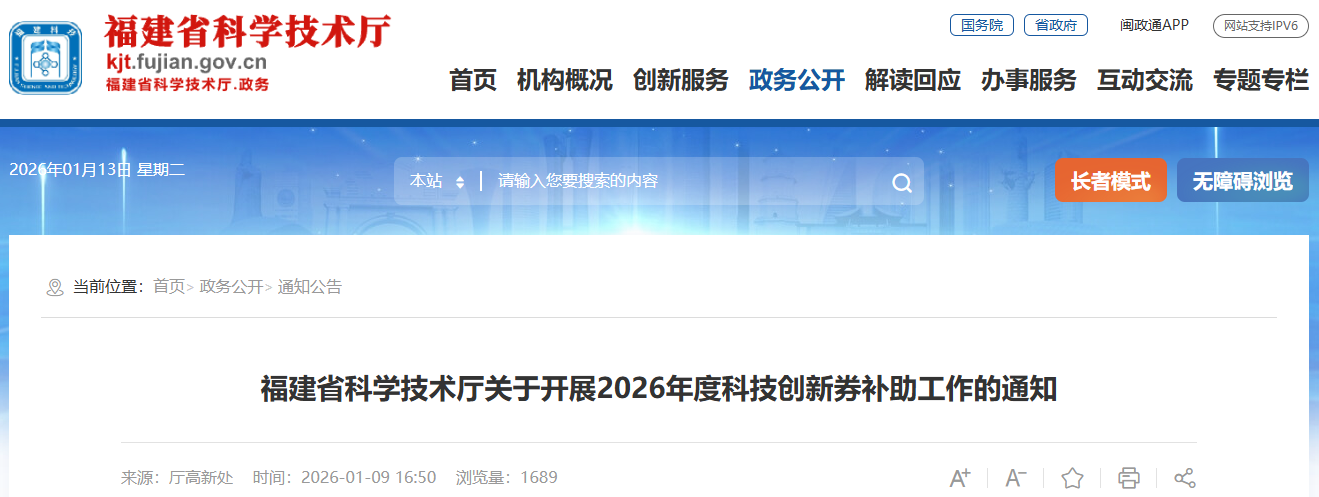 福建省科學技術(shù)廳關(guān)于開展2026年度科技創(chuàng)新券補助工作的通知