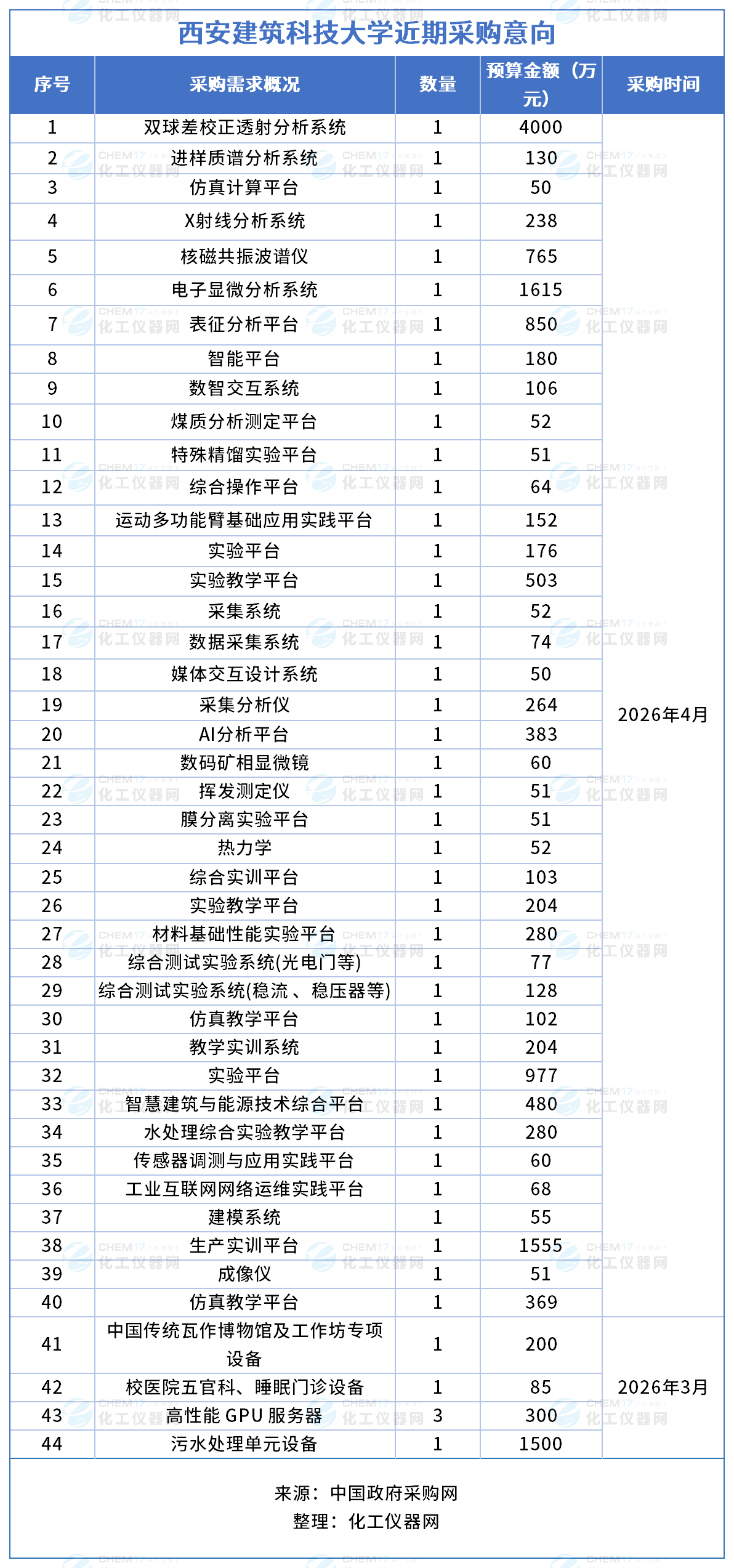 預算超1.7億!西安建筑科技大學發布近期采購意向