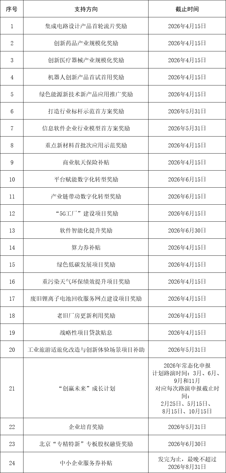 2.符合方向1-21、方向23條件的申報單位可在2026年3月4日至申報截止時間內(nèi)登錄北京市人民政府門戶網(wǎng)站“政策兌現(xiàn)”頻道(https://zhengce.beijing.gov.cn),選擇相對應(yīng)的項目,按照指引填報相關(guān)企業(yè)信息及對應(yīng)材料。
