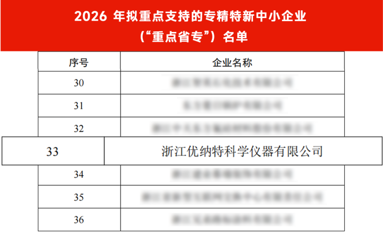 近日,浙江省經(jīng)濟和信息化廳公示了2026年擬重點支持的專精特新中小企業(yè)(“重點省?!保┟麊巍?00家企業(yè)實施融通入鏈“四提一強”推進計劃。浙江優(yōu)納特科學儀器有限公司憑借雄厚的技術創(chuàng)新能力和市場影響力,成功入選。