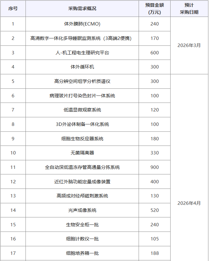 近期,上海臨床研究中心發(fā)布多項(xiàng)儀器采購(gòu)意向,計(jì)劃采購(gòu)高分辨空間組學(xué)分析質(zhì)譜儀、低溫顯微觀察系統(tǒng)、細(xì)胞生物反應(yīng)器系統(tǒng)、生物安全柜、細(xì)胞計(jì)數(shù)儀、二氧化碳細(xì)胞培養(yǎng)搖床、倒置熒光顯微鏡、超低溫冰箱等儀器設(shè)備,預(yù)算總金額15513.1萬(wàn)元。預(yù)計(jì)采購(gòu)時(shí)間2026年3月~5月。