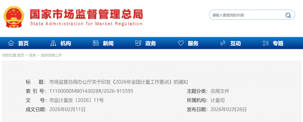 近日,市場監管總局印發《2026年全國計量工作要點》,明確2026年將緊緊圍繞“講政治、強監管、促發展、保安全”的工作總思路,緊扣“一個大市場、兩個綱要、三個監管、四個安全”工作著力點,大力實施計量強基工程,科學謀劃“十五五”計量工作,加強基礎建設,強化監管,創新服務,深化國際合作,加快構建國家現代先進測量體系,為基本實現社會主義現代化筑牢計量基礎。